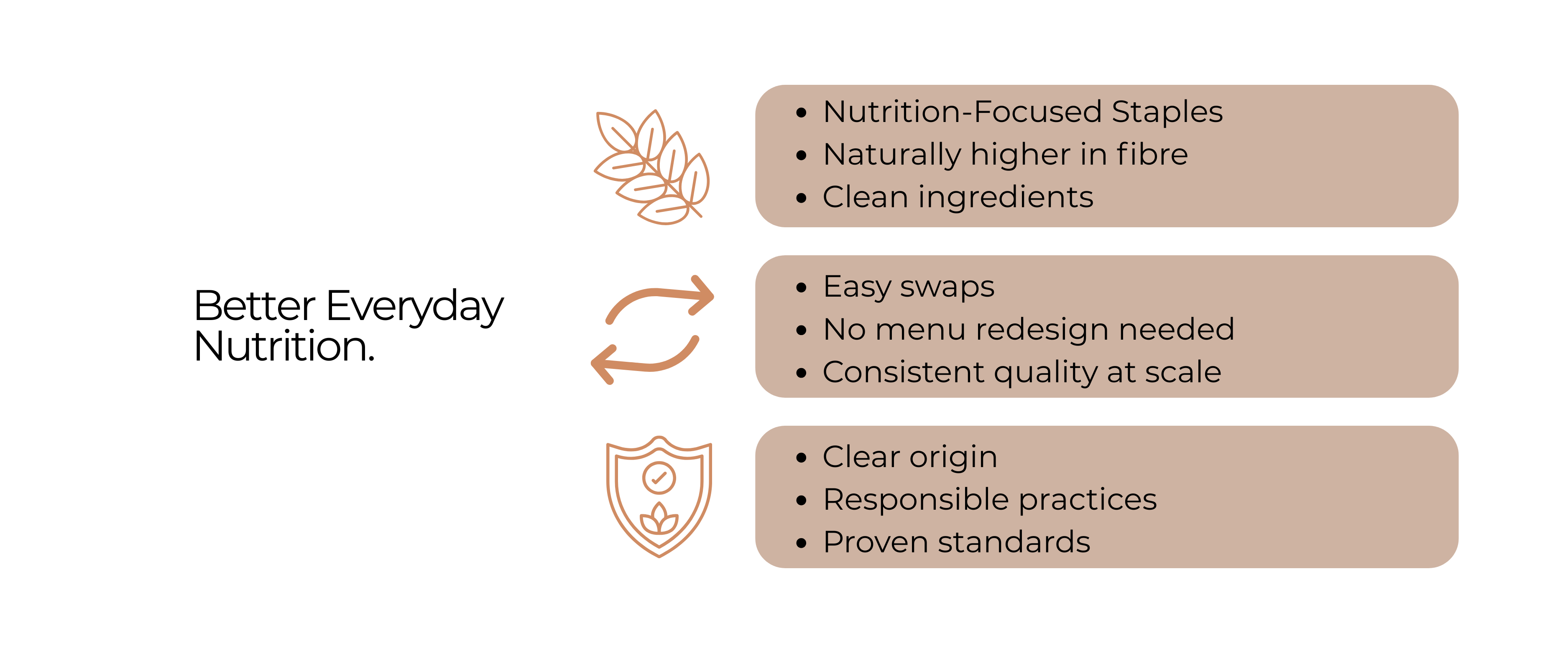 Myda Global focuses on staple foods that naturally increase the fibre content of everyday meals. We work with trusted producers to help institutions improve nutrition without adding complexity to their operations.